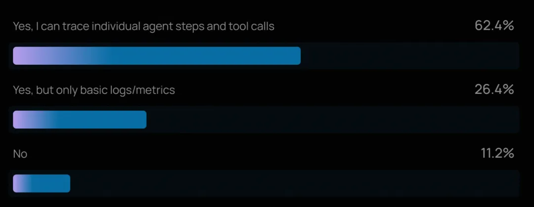 • 可观测性已成为标配:近 89% 的受访者为其智能体实施了可观测性方案,远超评估(evals)的采用率(52%)。
