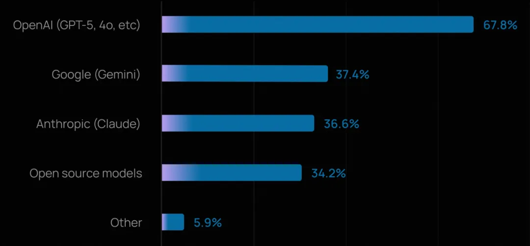 • 多模型策略成常态:OpenAI 的 GPT 系列模型占据主导,但 Gemini、Claude 和开源模型也获得广泛应用;微调尚未普及。