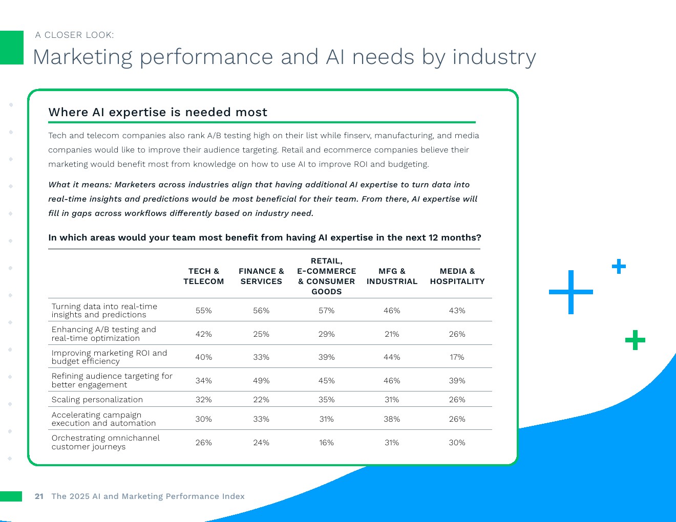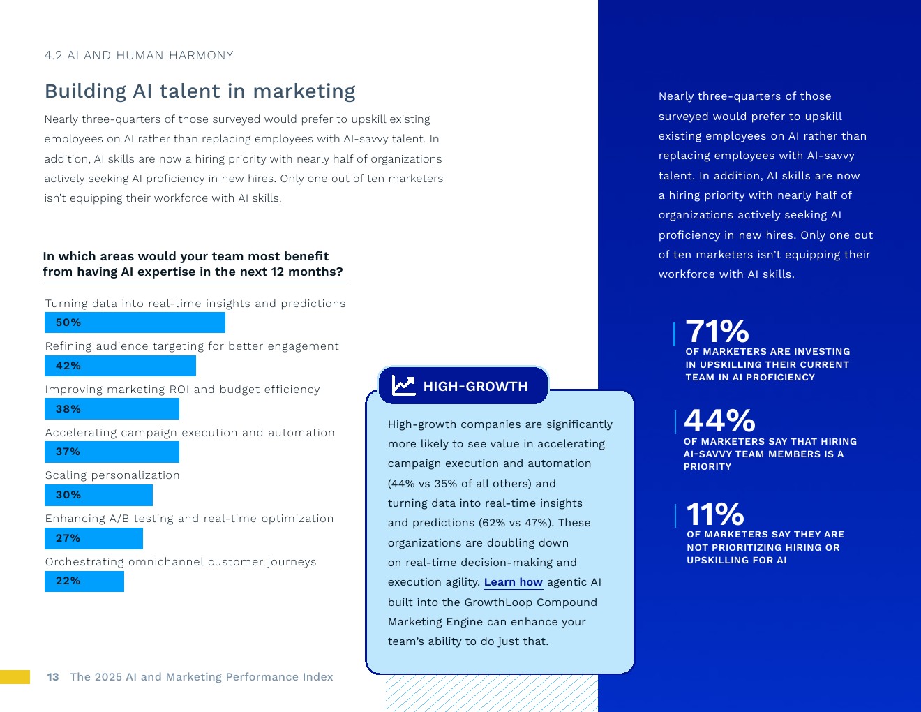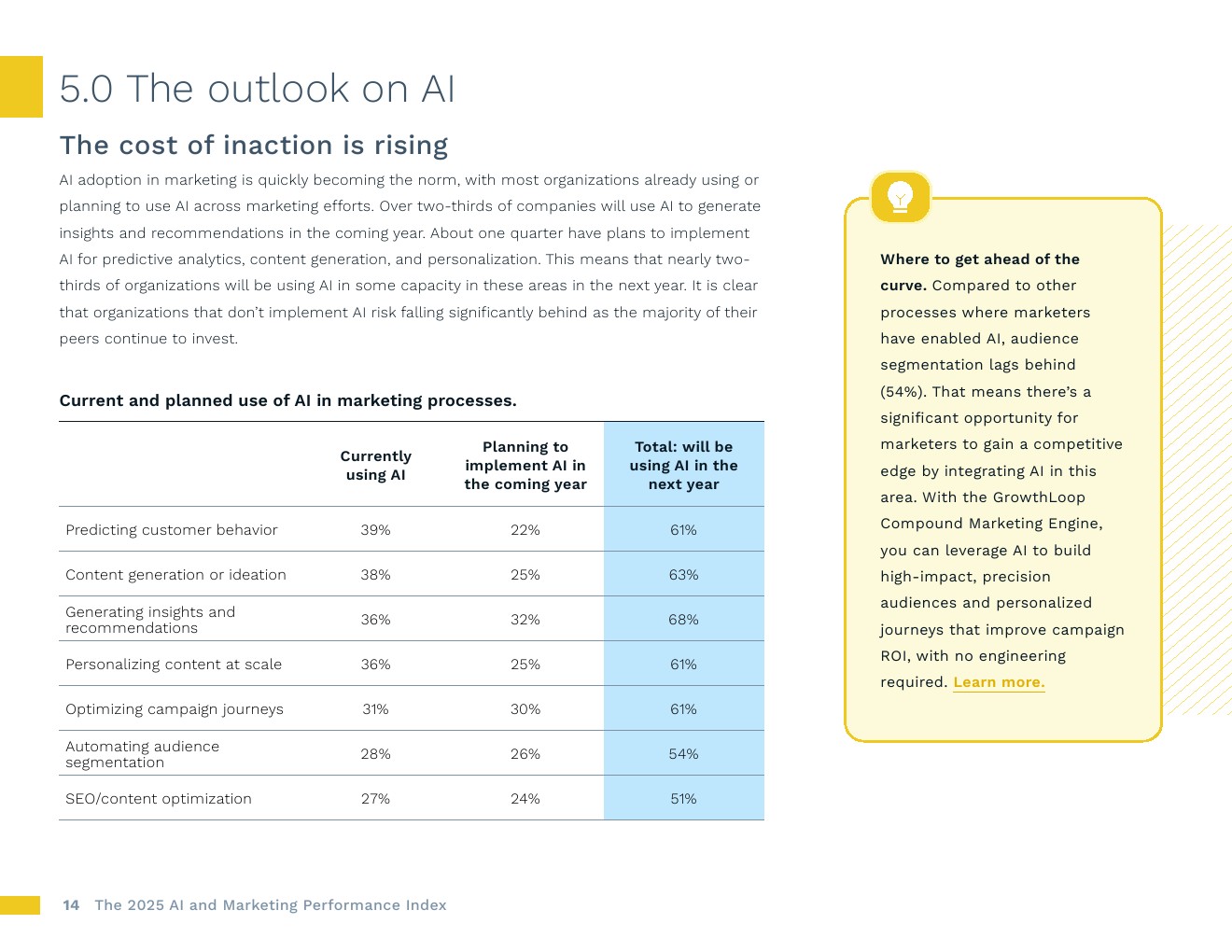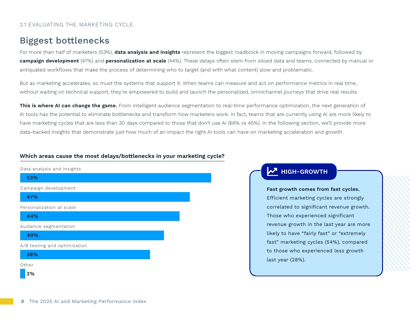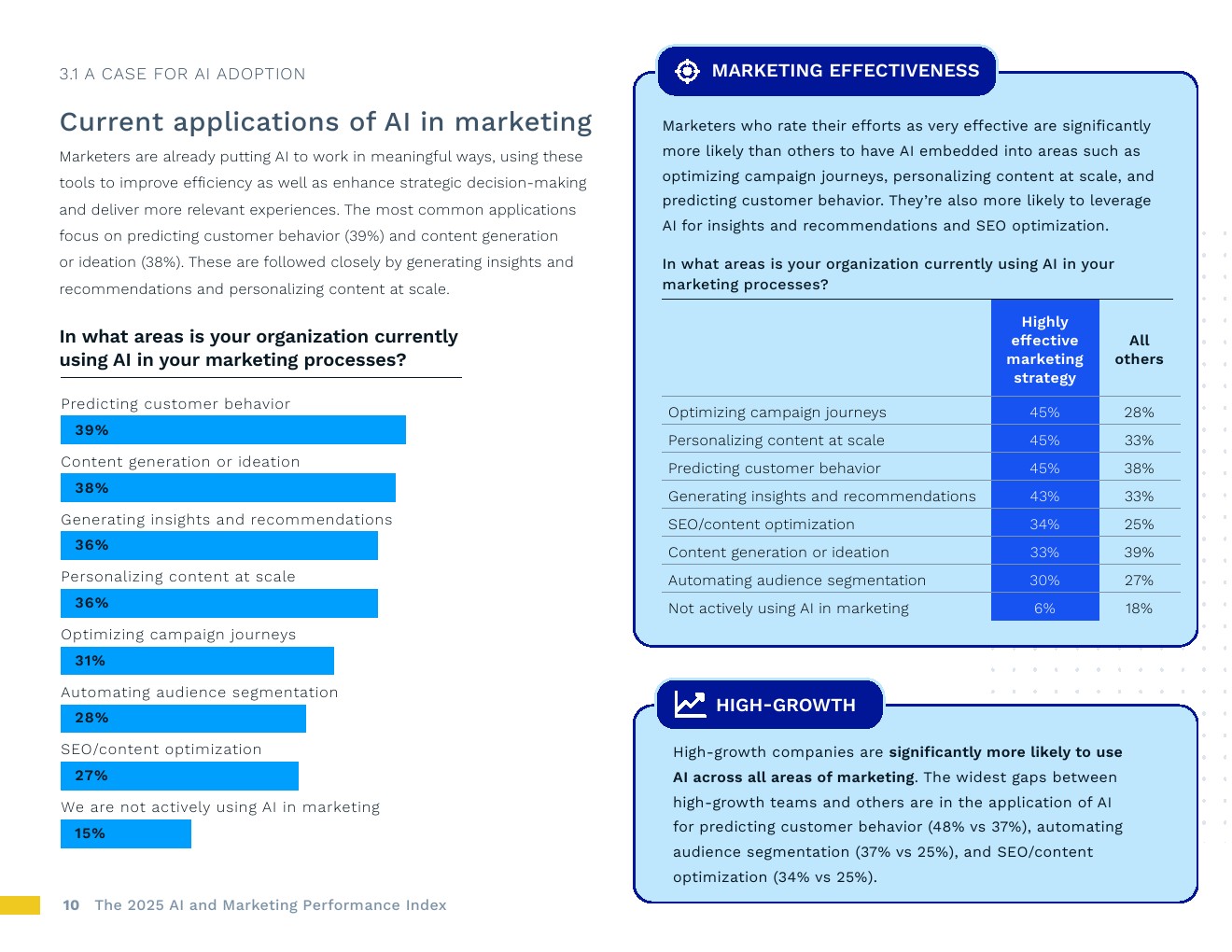 高增长团队在人工智能应用方面领先。报告最显著收入增长的企业,其营销流程中当前使用人工智能的比例持续更高,尤其是在预测客户行为(高增长企业为48%,其他企业为37%)、自动化受众分支(37%对比25%)和优化搜索引擎(34%对比25%)方面。