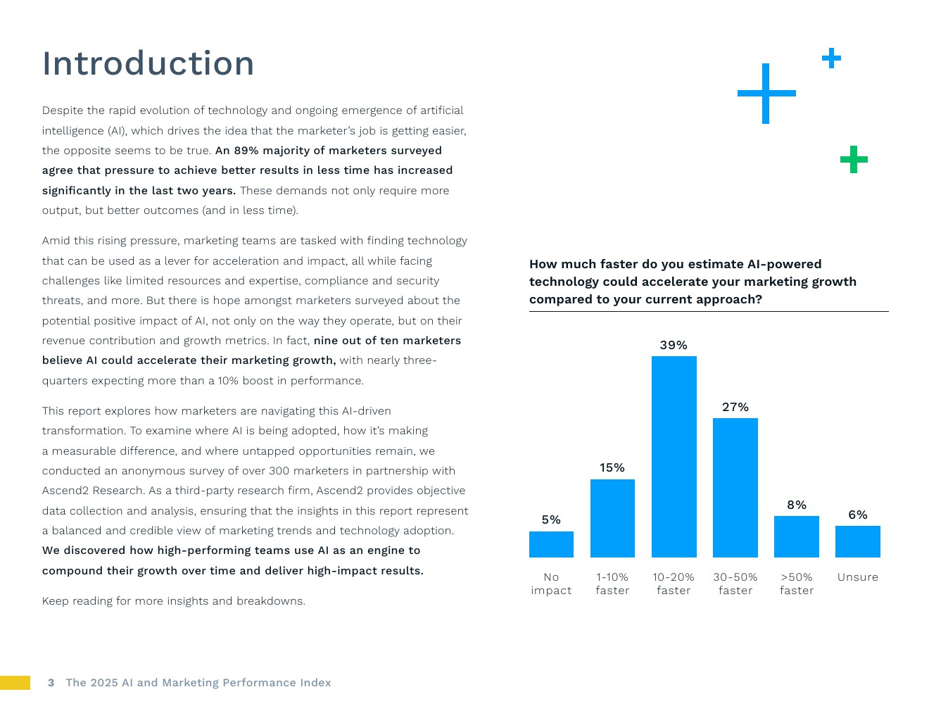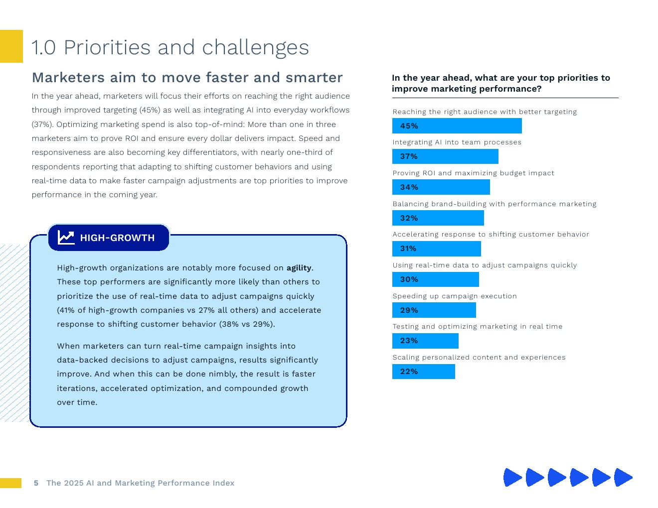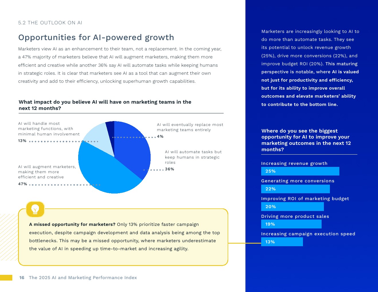 人工智能应用正在加速,绩效压力也在同步增加。89%的营销人员表示,在过去两年中,用更少时间交付更好成果的压力显著提高。对此,大多数人不只是为效率而转向人工智能。74%的人认为人工智能能将至少提高10%的增幅,超过1/3的人预计增幅将超过30%。