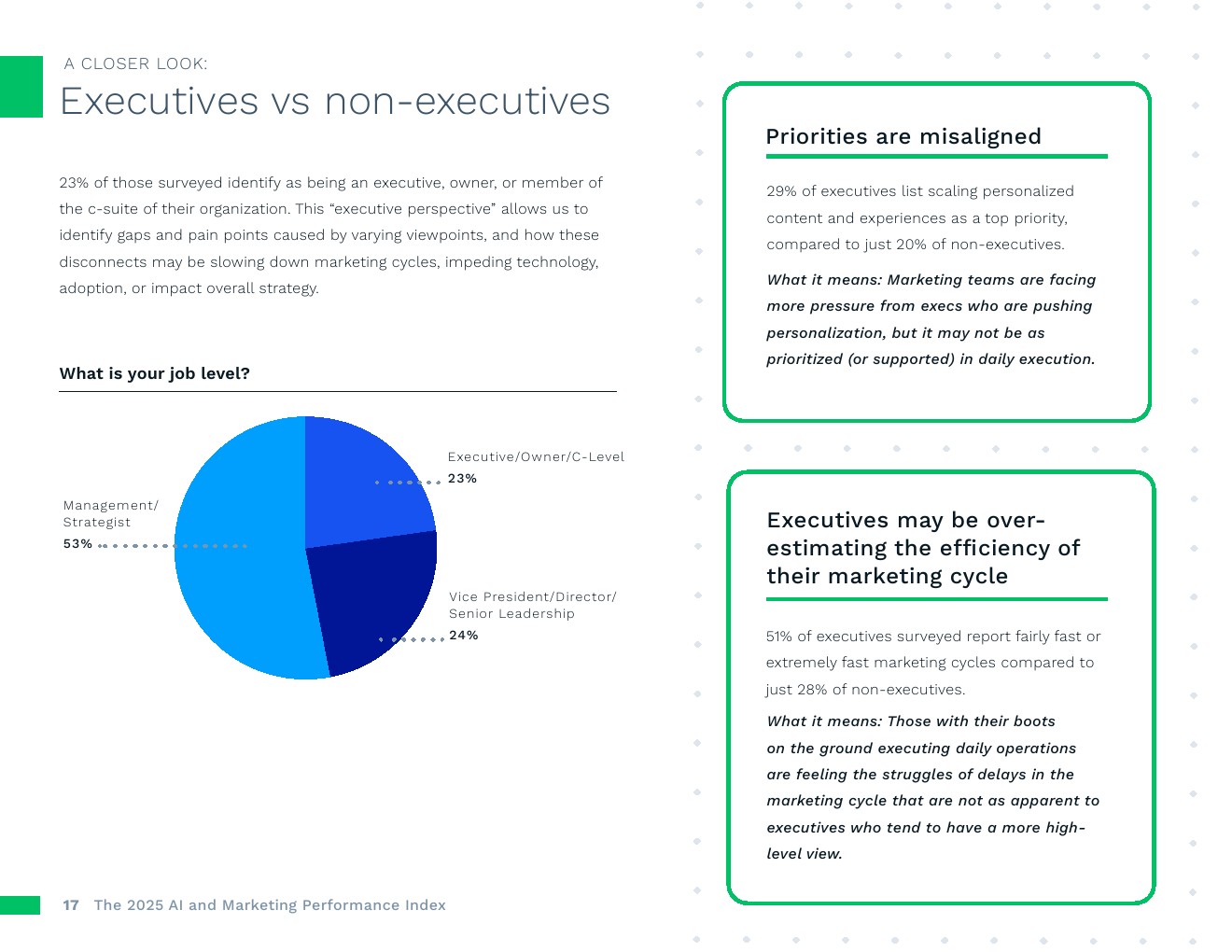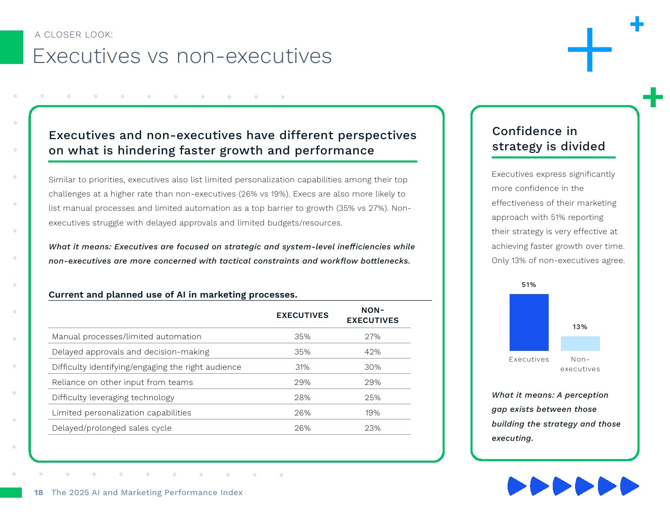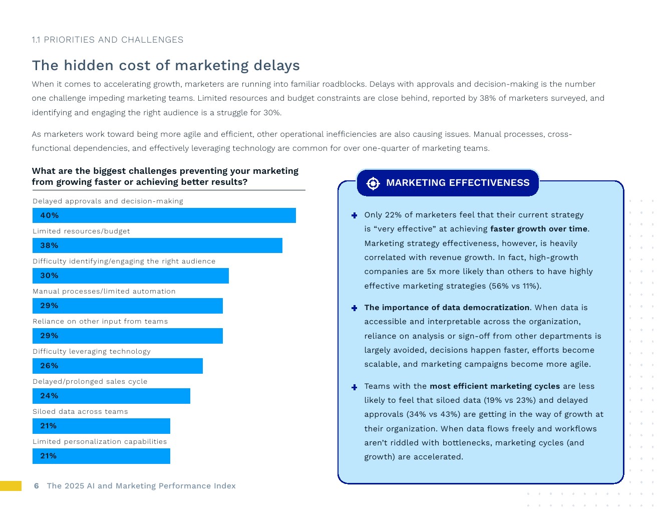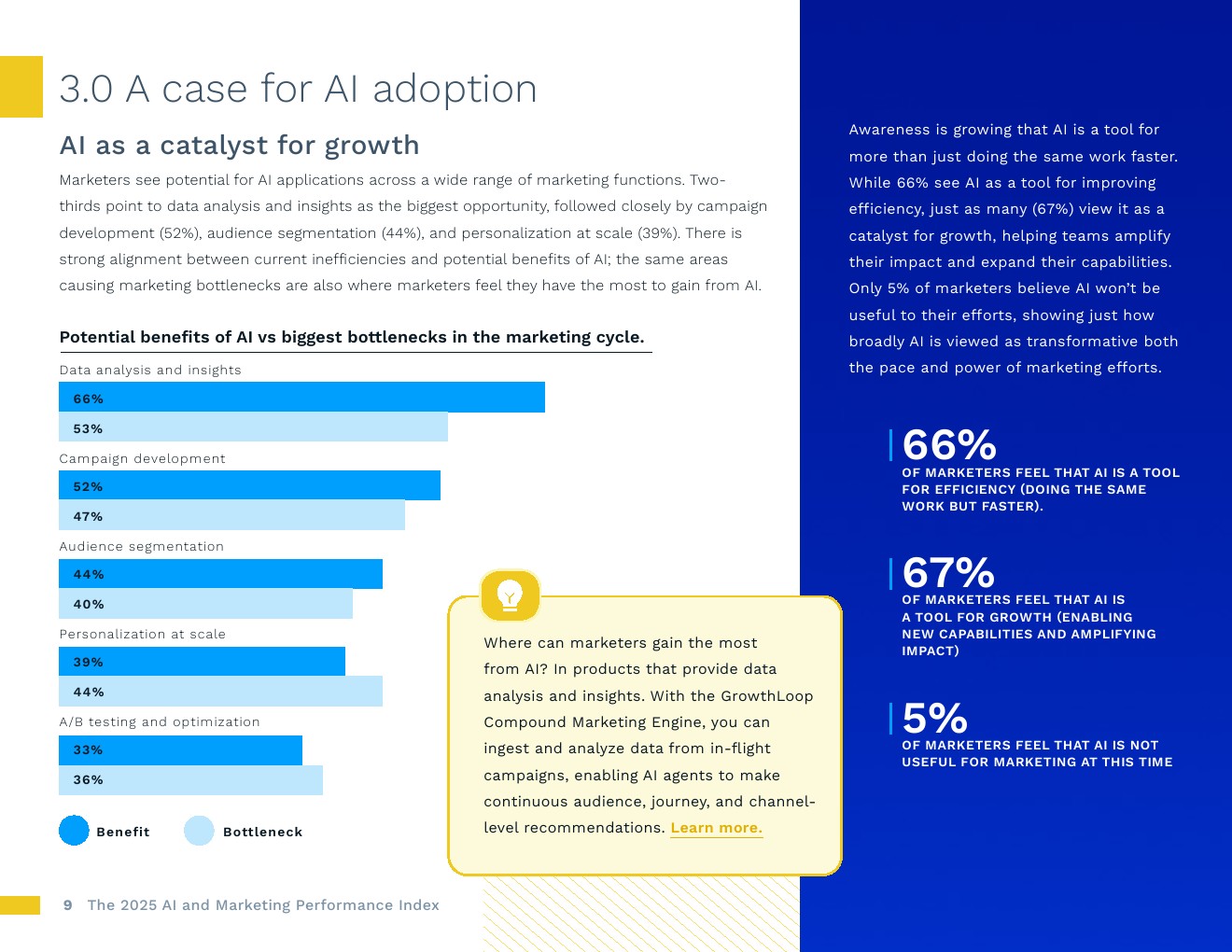 人工智能应用正在加速,绩效压力也在同步增加。89%的营销人员表示,在过去两年中,用更少时间交付更好成果的压力显著提高。对此,大多数人不只是为效率而转向人工智能。74%的人认为人工智能能将至少提高10%的增幅,超过1/3的人预计增幅将超过30%。