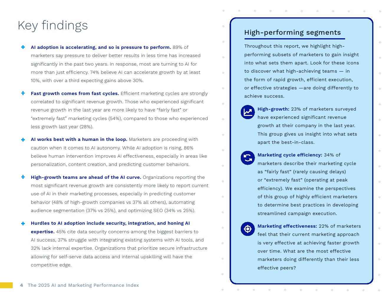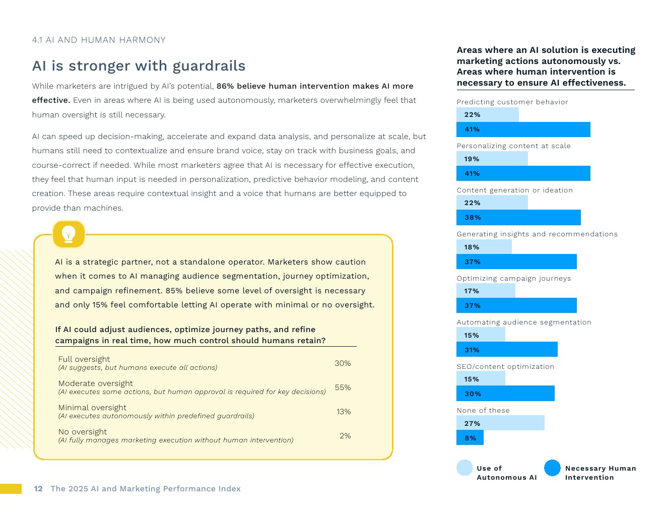 人机协同方能发挥人工智能最佳效能。营销人员在人工智能自主性方面谨慎行事。尽管人工智能应用率不断上升,86%的人认为人工干预能提升人工智能效能,尤其是在个性化、内容创作和预测客户行为等行业。
