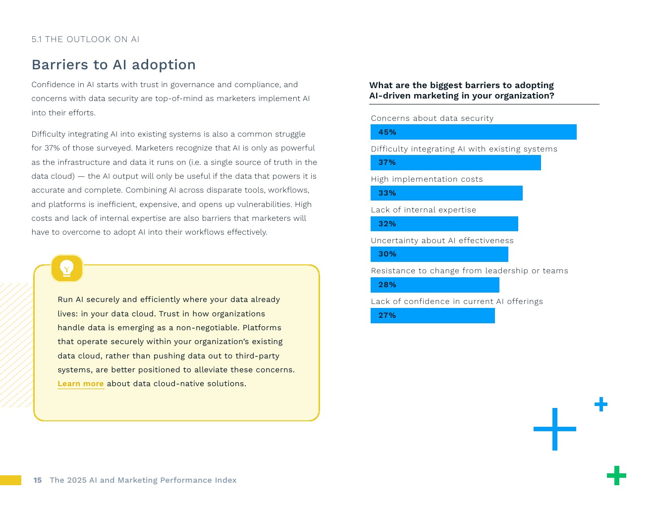 人工智能应用的主要障碍包括安全性、系统整合和专业能力提升。45%的受访者认为数据安全问题是人工智能成功的最大障碍,37%的受访者在将现有系统与人工智能工具整合方面遇到困难,32%的受访者缺乏内部专业知识。优先建设允许自助数据访问的安全基础设施并注重内部技能提升的企业将获得竞争优势。