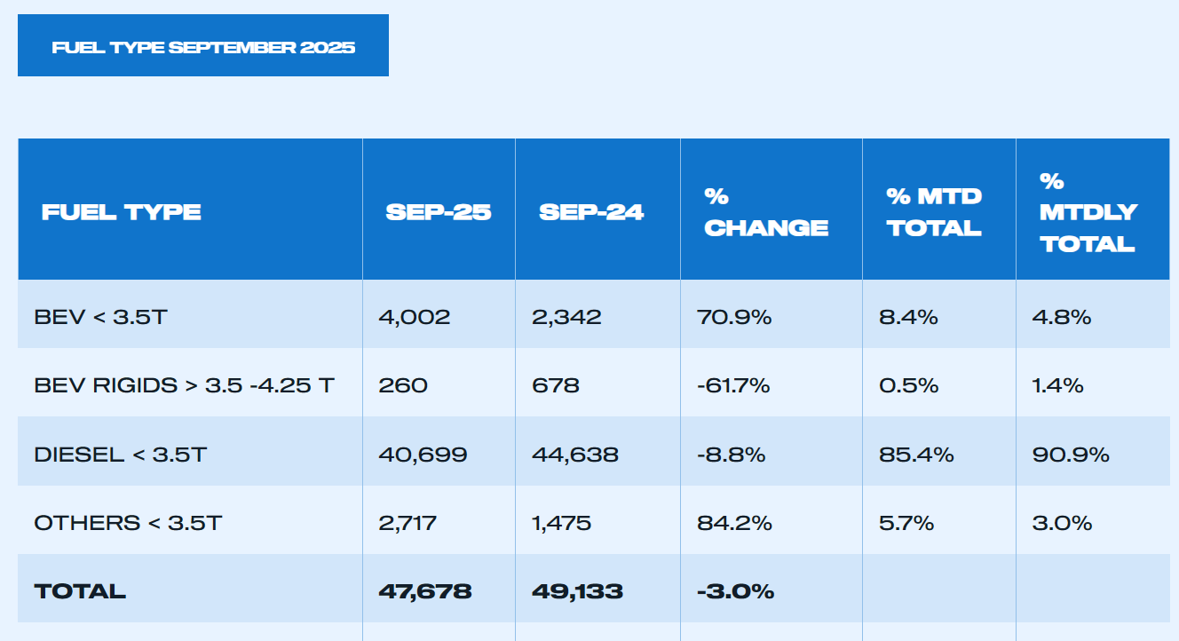 这一小幅下降延续了2025年的下行趋势,截至目前的注册量同比下降9.8%,反映出严峻的经济环境和疲弱的商业信心。然而,该表现是今年最小的降幅,并且仍高于疫情前水平,在这个市场最繁忙的月份之一提供了一个关键的积极信号——厢式货车制造商继续大力投资,将尖端的零排放车型推向市场。