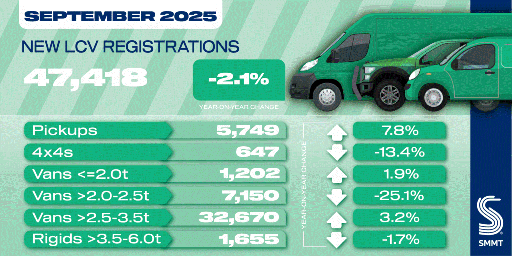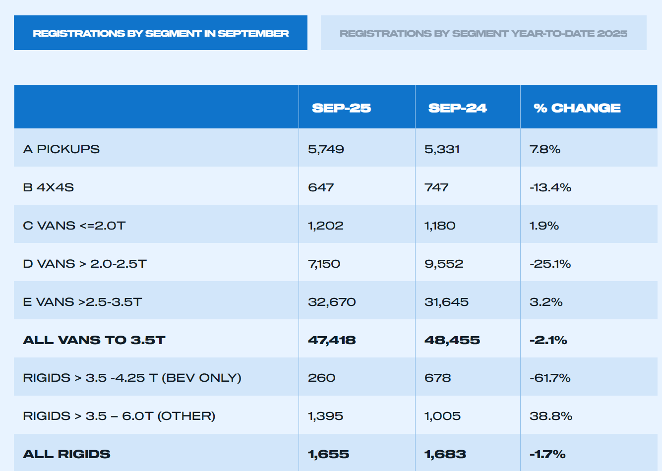 英国新型轻型商用车(LCV)九月份交付量下降2.1%,注册量为47,418辆厢式货车、皮卡和四驱车。