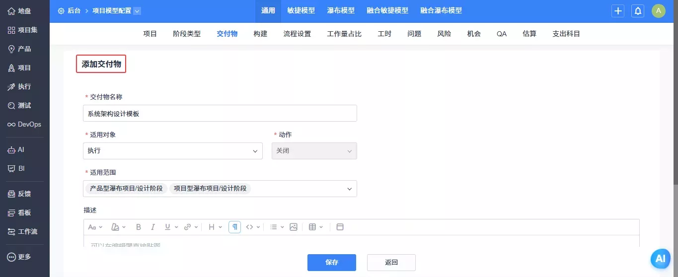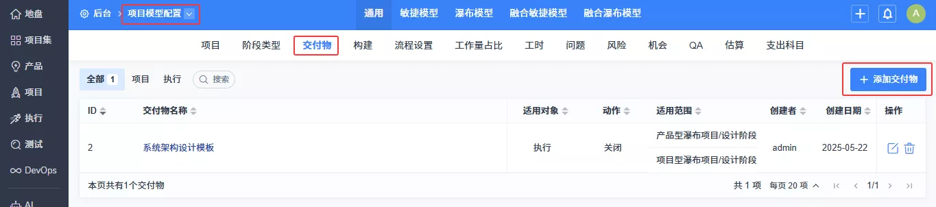 在禅道的交付物管理体系中,后台配置层扮演着至关重要的角色。管理员可在后台统一定义组织级的全量交付物库,所有交付物均存储在统一的交付物库中,确保组织内部交付物标准一致、规范落地。