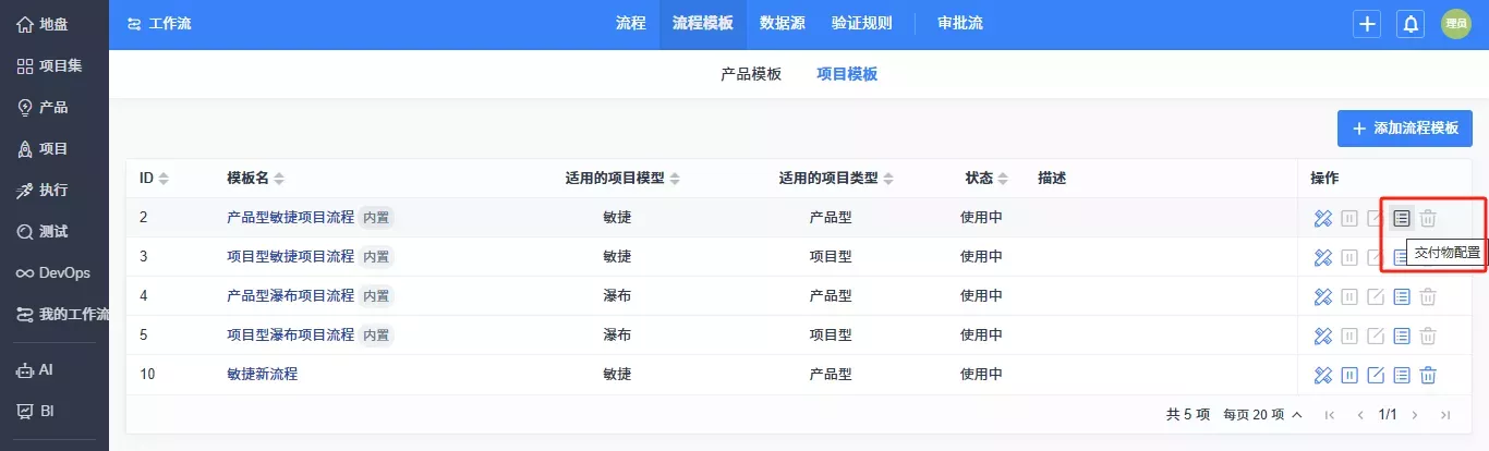 不同类型的项目需要不同的交付物组合。禅道的流程模板配置解决了这一难题。在项目流程模板中,配置人员可不同项目类型或阶段,灵活关联组织级的全量交付物。这样,每个项目模板的交付物配置都是个性化的,满足不同项目类型的需求。更为贴心的是,禅道系统会智能过滤不适用当前对象的交付物,并对已选择项进行置灰处理。