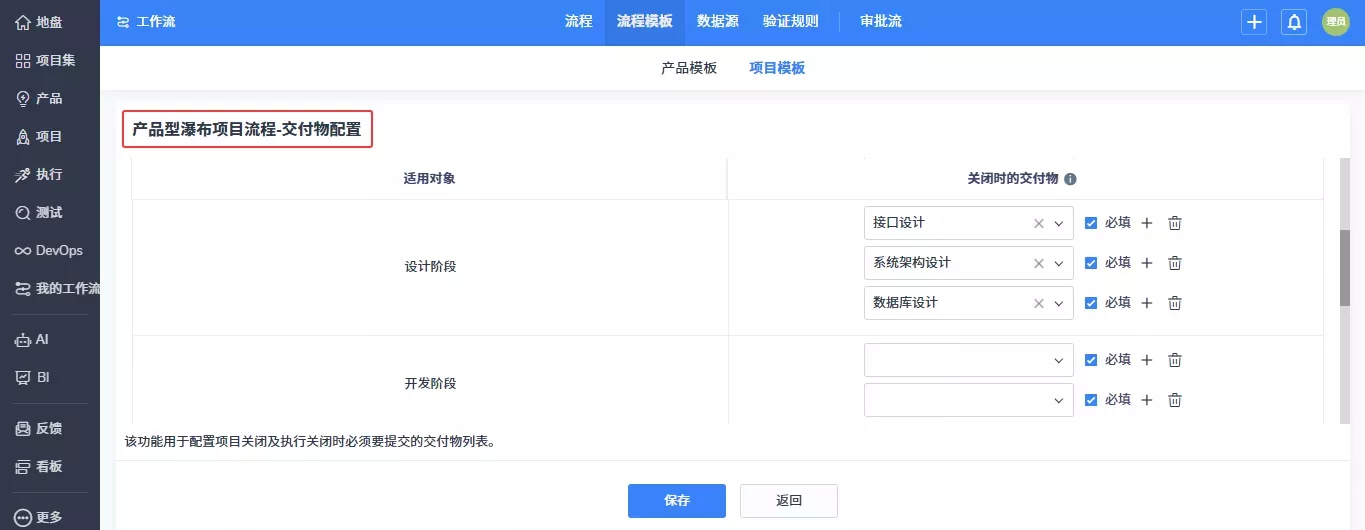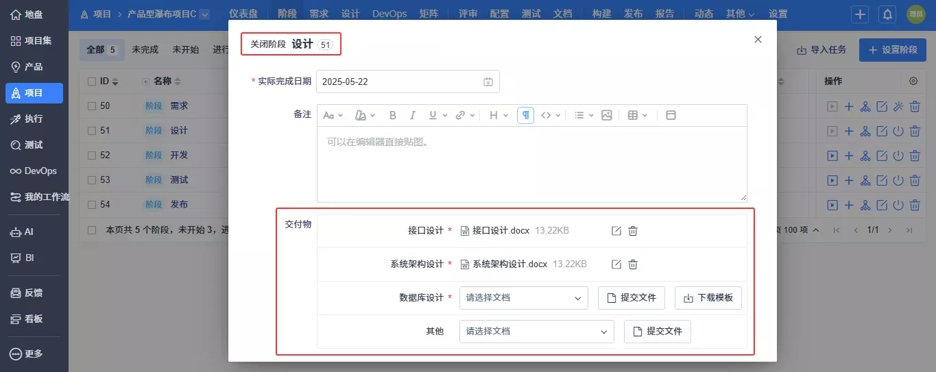 某科技公司项目团队,就借助禅道的这项功能,为其常用的“产品型瀑布项目”的流程模板中配置交付物。为“需求阶段”关联了“需求规格说明书”,为“测试阶段”绑定了“测试报告”,实现了项目类型-阶段-交付物的精准匹配。