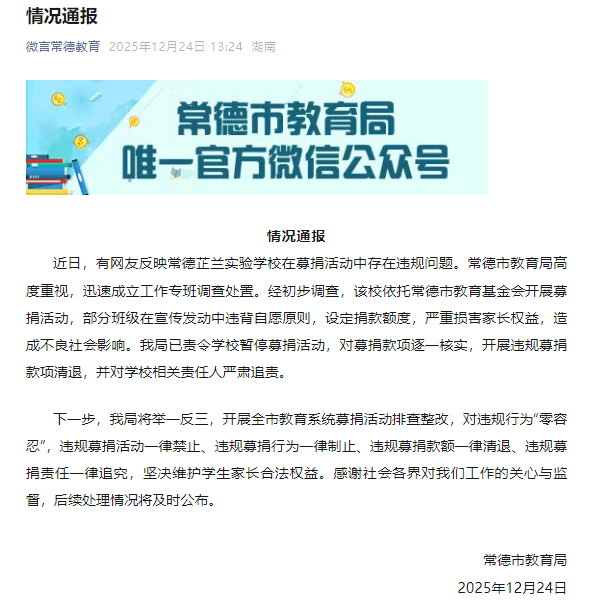 近日,有网友反映常德芷兰实验学校在募捐活动中存在违规问题。常德市教育局高度重视,迅速成立工作专班调查处置。经初步调查,该校依托常德市教育基金会开展募捐活动,部分班级在宣传发动中违背自愿原则,设定捐款额度,严重损害家长权益,造成不良社会影响。我局已责令学校暂停募捐活动,对募捐款项逐一核实,开展违规募捐款项清退,并对学校相关责任人严肃追责。