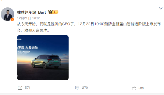 此前在12月21日,长城哈弗品牌总经理赵永坡正式发文宣布接任魏牌CEO,并预告了12月22日19:00魏牌全新蓝山智能进阶版上市发布会。