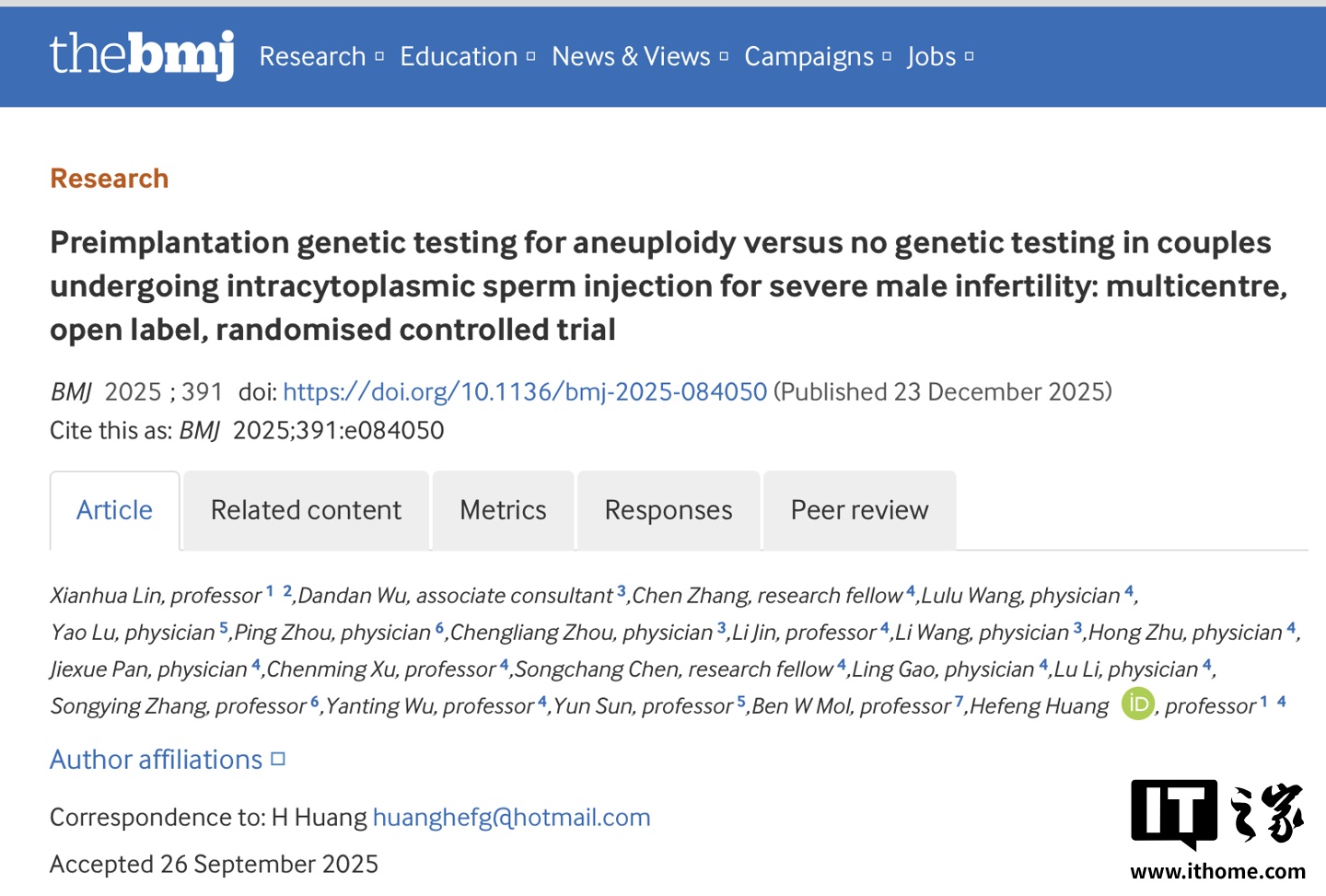 IT之家 12 月 24 日消息,据新华社今日报道,一项由中国科学院院士、浙江大学医学院附属妇产科医院名誉院长黄荷凤领衔的研究成果,于 12 月 23 日发表在国际医学期刊《英国医学杂志》上,为全球辅助生殖技术的指南制定与临床实践提供“中国方案”。