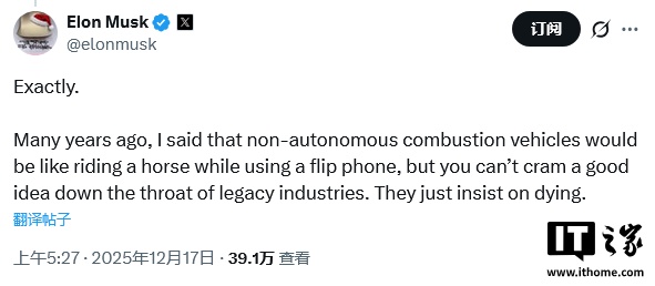 IT之家注意到,12 月 17 日,特斯拉首席执行官埃隆・马斯克在社交网络上评价称,没有自动驾驶能力的燃油车,就像“骑着马用着翻盖手机”。