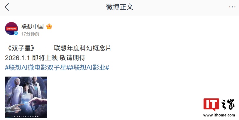 IT之家 12 月 25 日消息,联想中国官方今日宣布,联想年度科幻概念片《双子星》将在 2026 年 1 月 1 日上映。