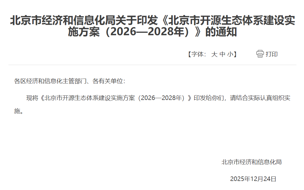 IT之家 12 月 25 日消息,北京市经济和信息化局 12 月 24 日印发北京市开源生态体系建设实施方案(2026—2028 年),提出打造北京市开源创新高地,力争培育 10 个具有国际影响力的开源项目(国际引领的开源项目不少于 5 个),培育 30 个国内明星开源项目(人工智能领域开源项目不少于 10 个),实现 100 个行业大模型落地应用。