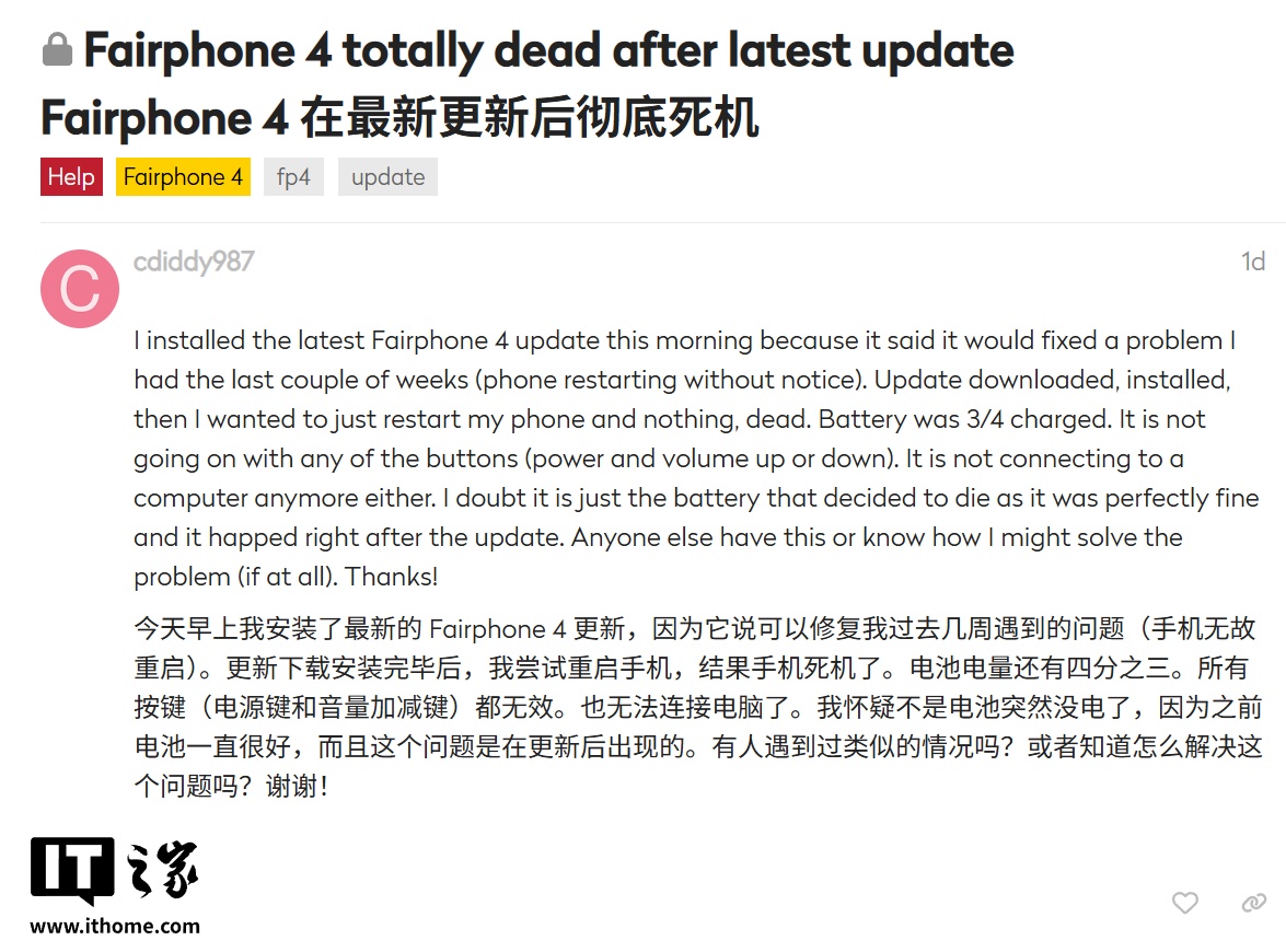 该公司于 12 月 23 日向 Fairphone 4 用户推送了版本号为 FP4.QREL.15.15.2 的系统更新。然而,这一本应提升体验的升级却酿成了事故:多名用户在官方论坛反馈,手机在安装更新并重启后彻底失去响应,沦为无法使用的“砖头”。