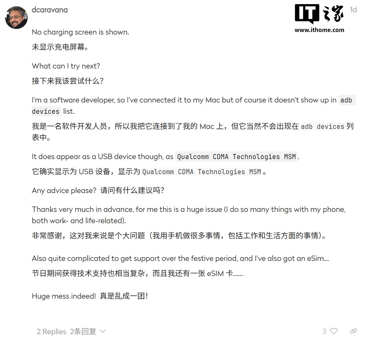 另一位用户 hamletdothrock 也遭遇了同样困境,他补充道:“我的情况一模一样,手机现在就是一块砖头,插上充电器也毫无反应,甚至无法尝试强制重启。”