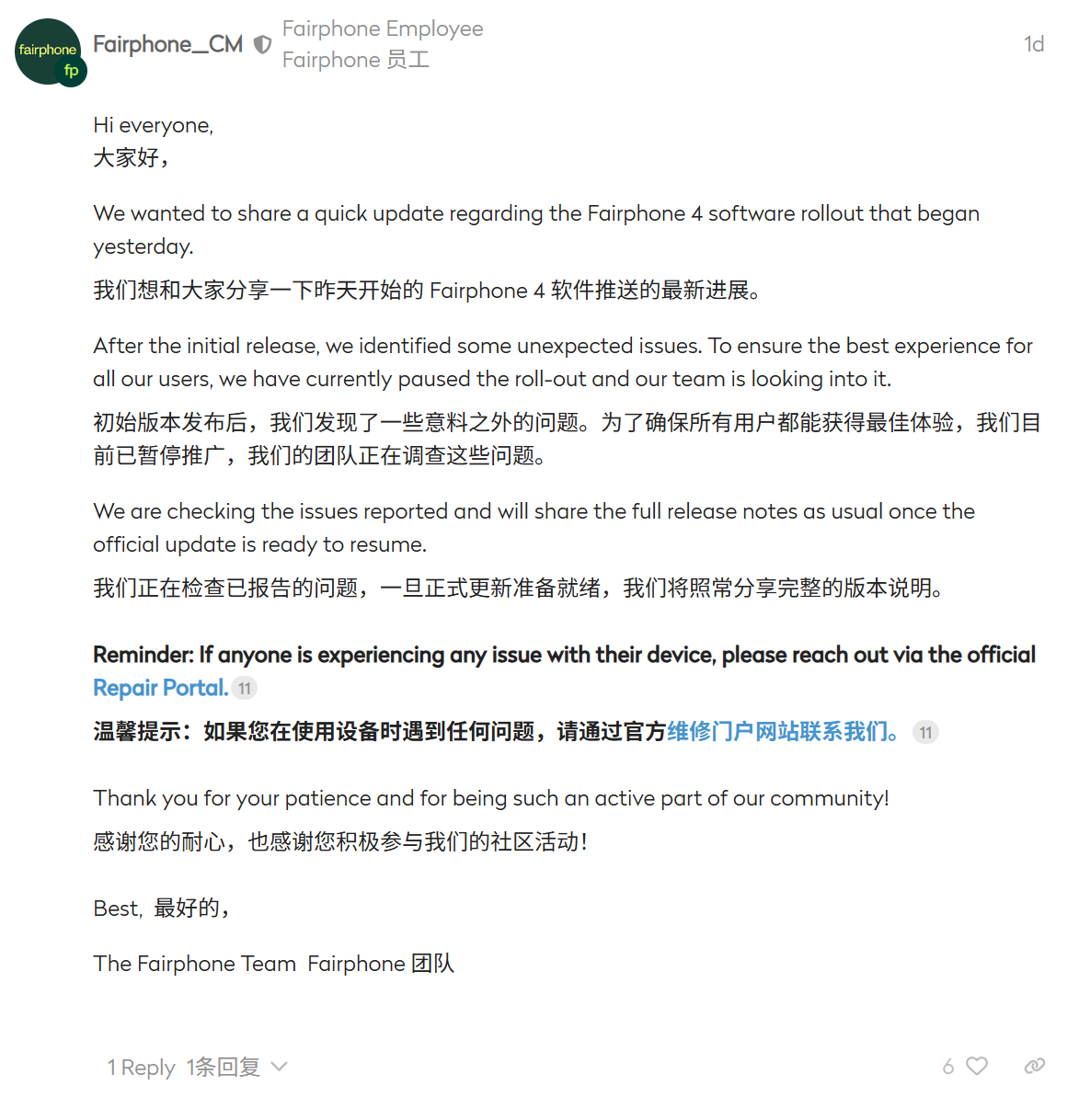 面对涌现的故障报告,Fairphone 迅速做出了反应。官方在社区发布公告,确认在初始发布后发现了“意外问题”。