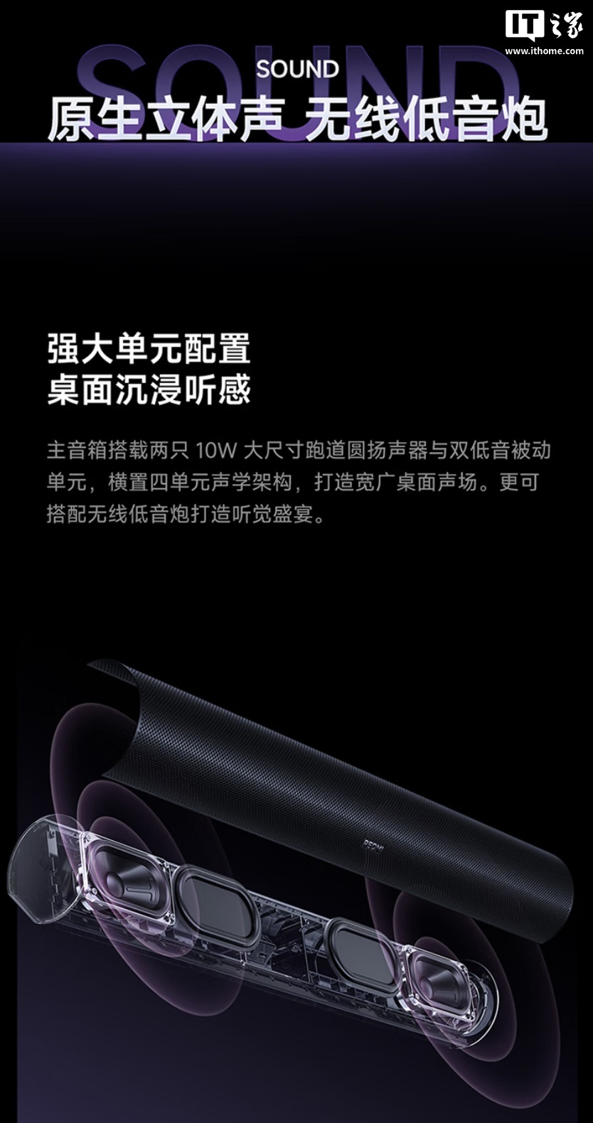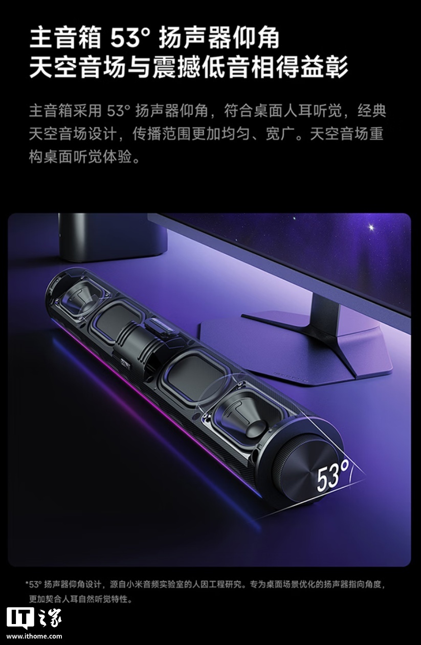 据介绍,这款音箱搭载两只 10W 大尺寸跑道圆扬声器与双低音被动单元,可打造宽广桌面声场,主扬声器采用 53° 仰角设计,符合桌面人耳听觉,可让传播范围更均匀、宽广。