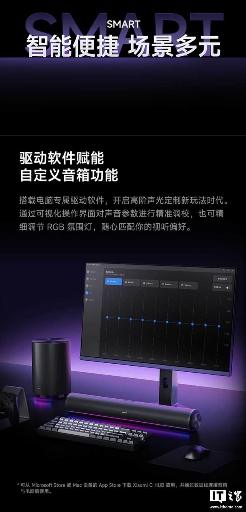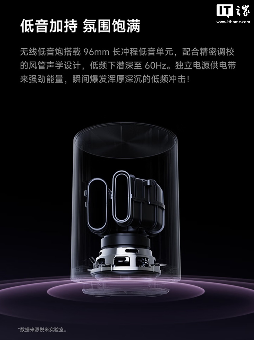 该音箱套装中的无线低音炮则搭载 96mm 长冲程低音单元,配合精密调校风管声学设计,低频下潜深至 60Hz,拥有独立供电,采用 2.4GHz 无线方式连接主音箱,可同步强劲低音,带有炫彩 RGB 氛围灯,可跟随音乐律动。