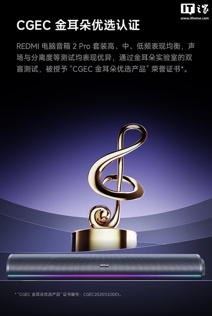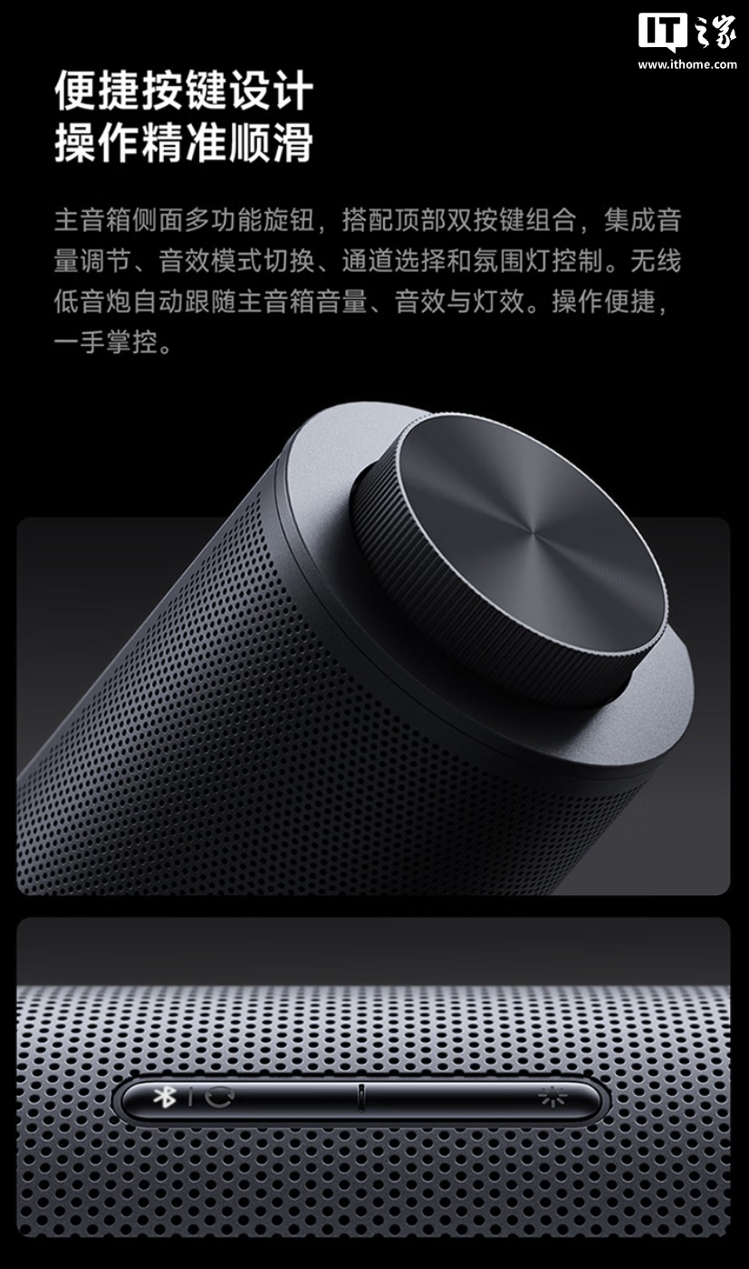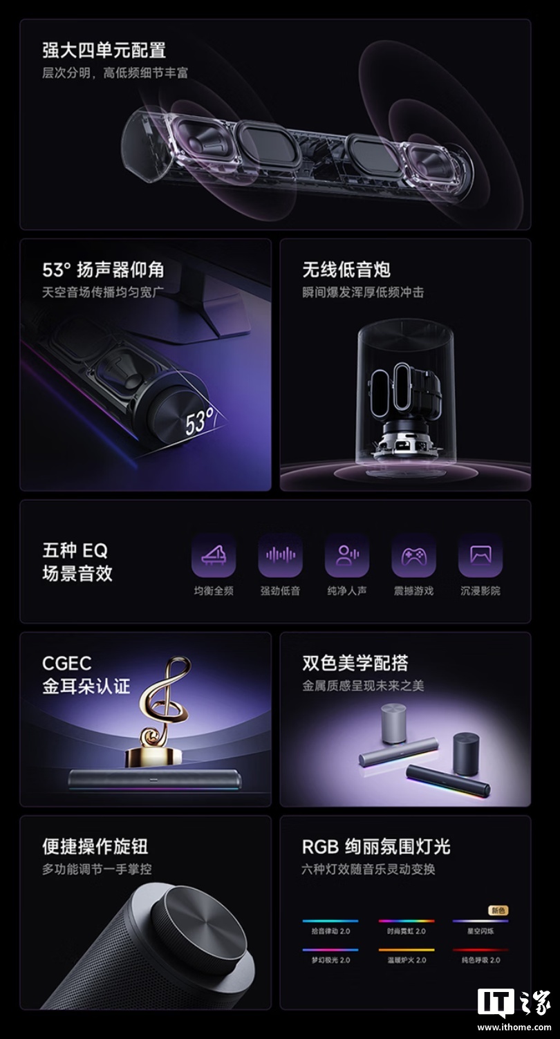此外,这款音箱还带有“CGEC 金耳朵优选认证”,采用 DSP 多音效技术,满足视听娱乐不同场景需求,主体侧面拥有多功能旋钮,可调节音量、切换音效模式和控制氛围灯,可安装专属驱动软件控制声音参数,支持 USB 数字连接、蓝牙 5.3、AUX 三种连接方式。