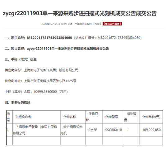 在中国政府采购网上,编号zycgr22011903的采购公告中提到科技部以单一来源方式采购了一台步进扫描式光刻机,中标金额约1.099亿元,中标方是上海微电子公司,货物型号为SSC800/10。