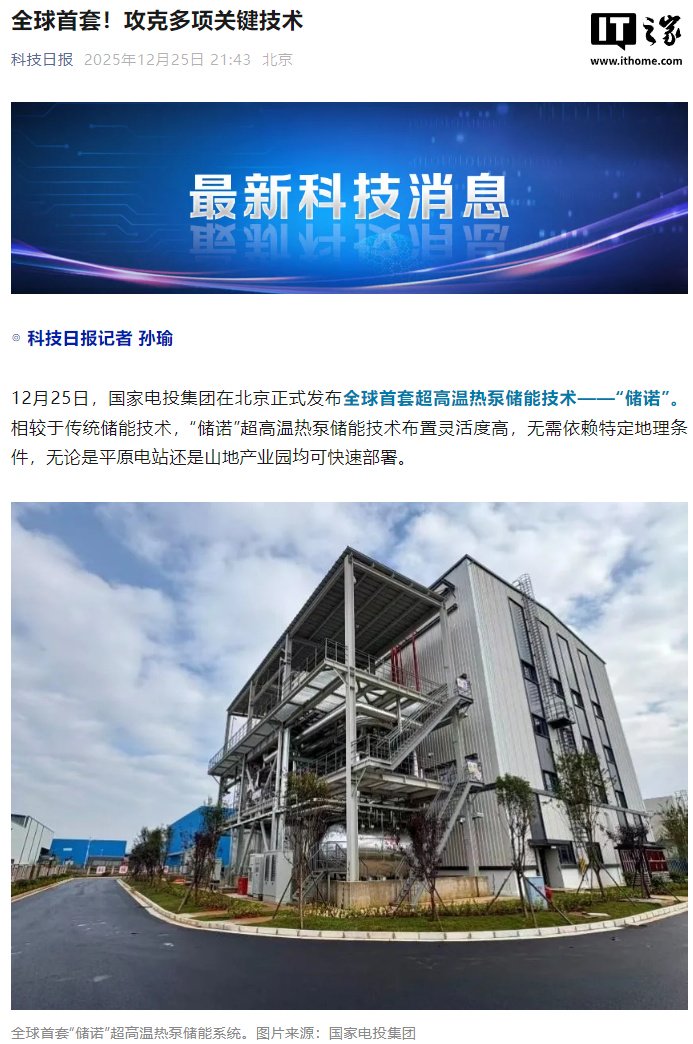 IT之家 12 月 26 日消息,据科技日报报道,12 月 25 日,国家电投集团在北京正式发布全球首套超高温热泵储能技术 ——“储诺”。