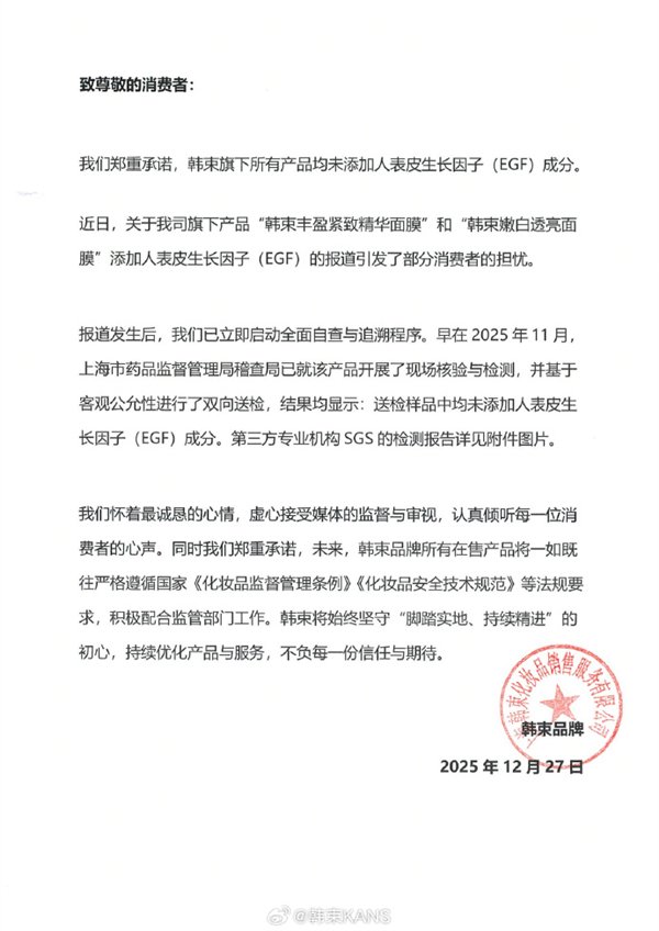 快科技12月27日消息,今日,韩束在其官方微博发文承诺,韩束旗下所有产品均未添加人表皮生长因子(EGF)成分。