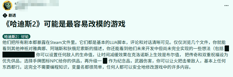 这当然是游戏的开发商Supergiant Games有意为之。早在2020年的初代《哈迪斯》时期,其就在与玩家交流的问答环节提及:“游戏的许多方面都很容易修改,因为数据都是公开的。”玩家能够更改所有的文本和数字,并为游戏自由添加内容不受限制。