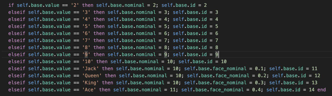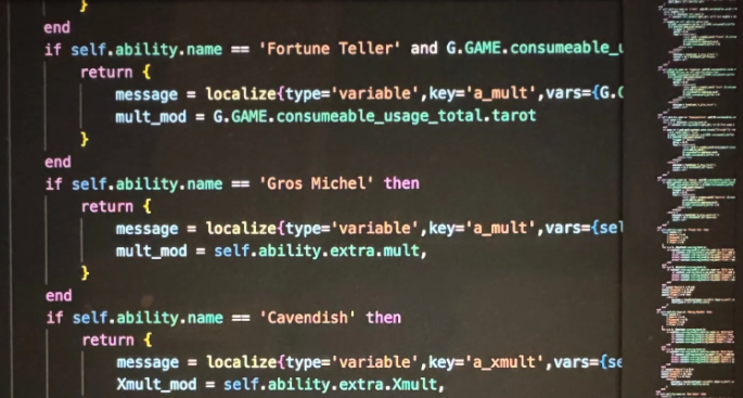 2024年的《小丑牌》拿奖拿到手软,俨然被行业视为风向标,但其游戏代码却远不如游戏设计那么优美,许多复杂的游戏逻辑,如不同小丑牌的效果叠加、分数计算,都是直接用大量的、嵌套的if-else语句堆砌而成,导致代码看起来原始且重复。