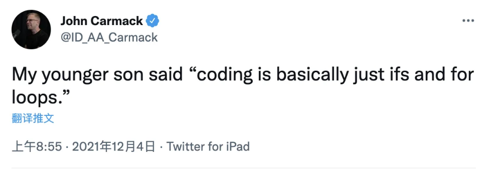 知名程序员、id Software创始人之一约翰·卡马克曾举证:“我儿子说‘写代码不过是if、else和for循环而已’”