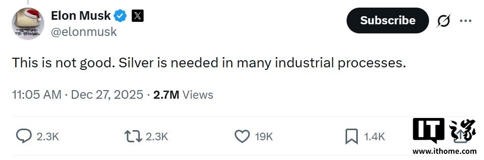 IT之家 12 月 28 日消息,本周白银首次逼近 80 美元 / 盎司,特斯拉首席执行官埃隆・马斯克对白银价格上涨表示担忧。他在社交媒体平台“X”发帖称:“这可不好。白银在许多工业生产过程中都必不可少。”
