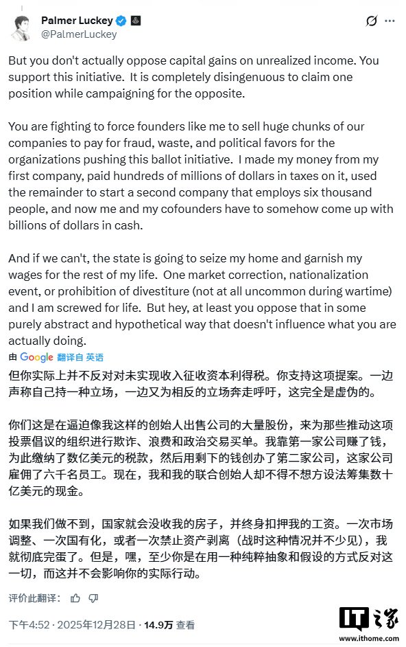 防务科技初创企业 Anduril 联合创始人帕尔默・勒基警告称,这项税收将迫使企业创始人抛售大量公司股权,以支付那些“为推动该投票提案的组织输送利益、滋生腐败与浪费的成本”。