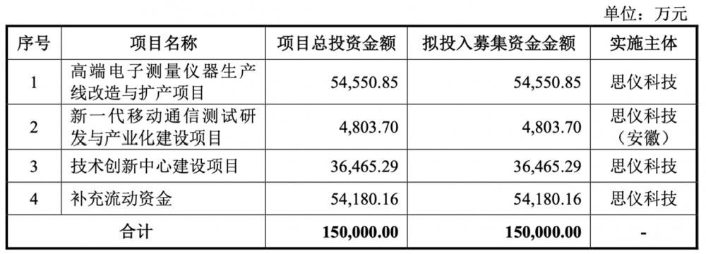 根据招股说明书显示,思仪科技本次IPO拟募资15亿元,主要用于“高端电子测量仪器生产线改造与扩产项目”“新一代移动通信测试研发与产业化建设项目”“技术创新中心建设项目”及补充流动资金。