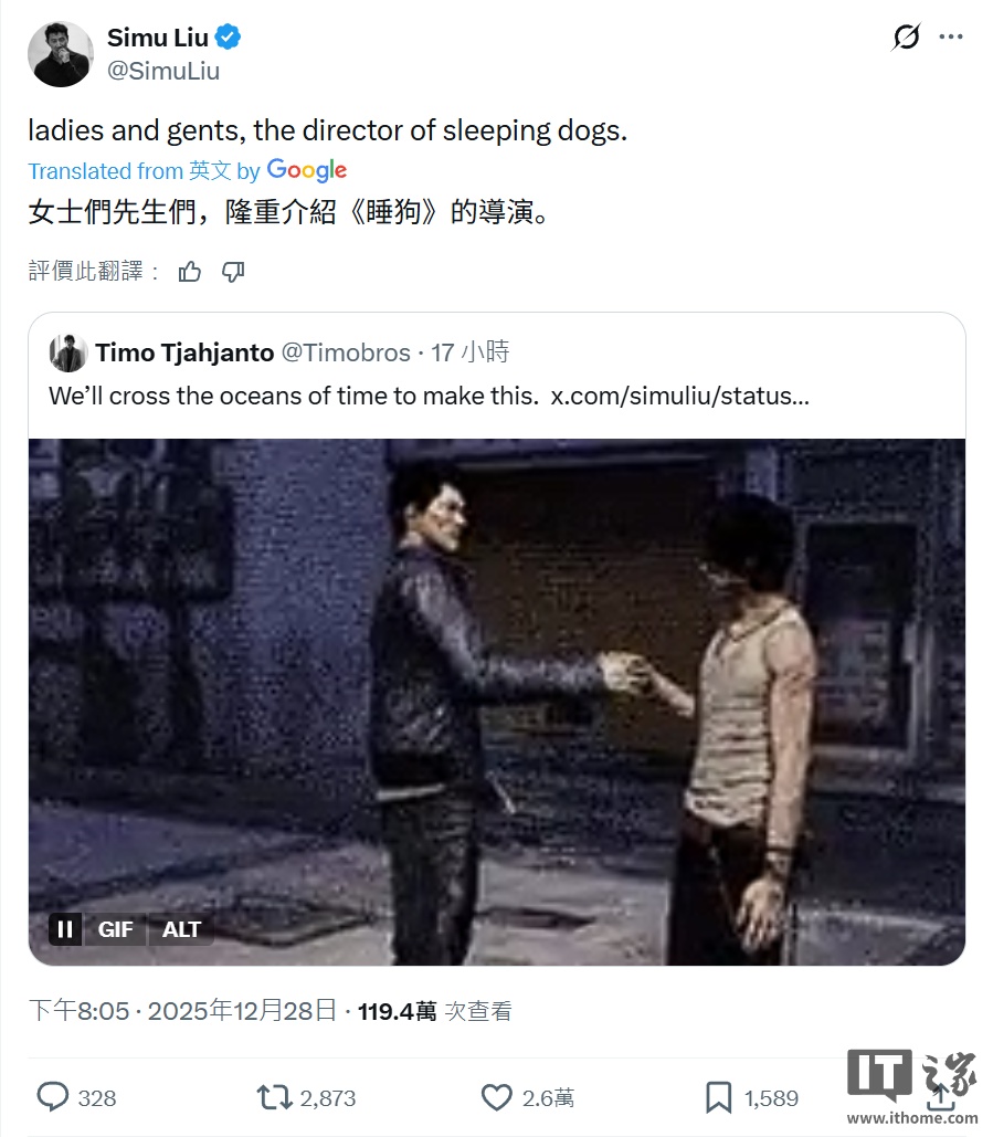IT之家 12 月 29 日消息,演员刘思慕(Simu Liu)昨天在 X 平台发文,确认提摩・塔坚德(Timo Tjahjanto)将担任《热血无赖》游戏改编真人电影的导演。