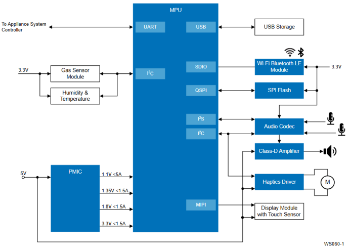 这种系统的设计支持触觉反馈触摸屏、语音引导和多模态输入,可实现与多种家电的无缝交互。 集成式 LCD 可呈现丰富的 GUI 和状态界面,而配备 Wi-Fi 和低功耗蓝牙®的高端型号可以和智能手机轻松配对,并集成到智能家居生态系统中。