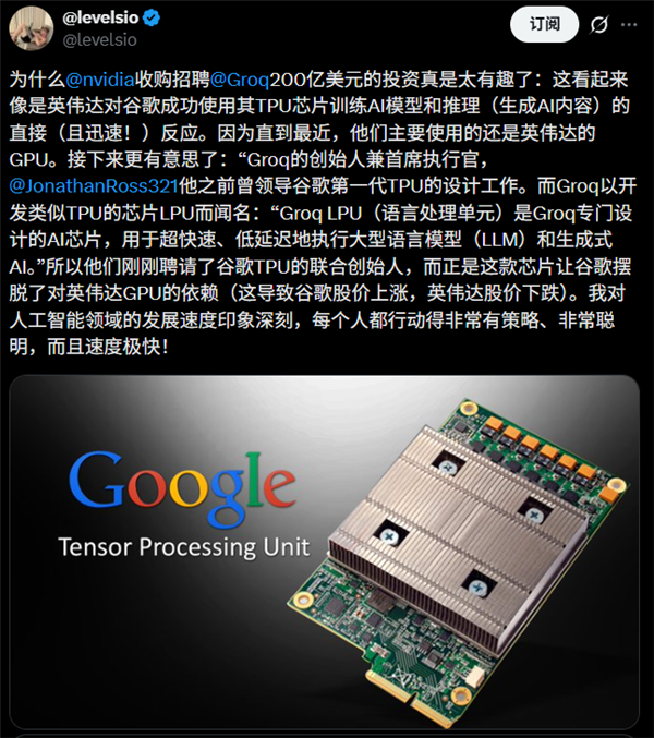 大伙儿有说英伟达加强垄断的,有分析 Groq 技术优势的,不过讨论最多的,还是老黄真被前一阵子谷歌的 TPU 给刺激到了。。。