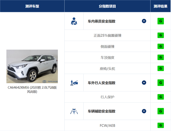 这也是为啥当年的丰田 RAV4 荣放被喷得这么惨,但它却在中保研的测试里头依旧获得了全 G 的好成绩。