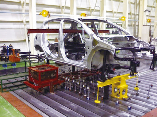 为了测出这个数据,车企和实验室们需要准备这样一套试验台架( 图例为白车身测试台架,还有加上了各种零件的整车台架 )。它可以在拆下车轮的情况下固定好车身的后轴,同时给前轴施加一个旋转的力矩。