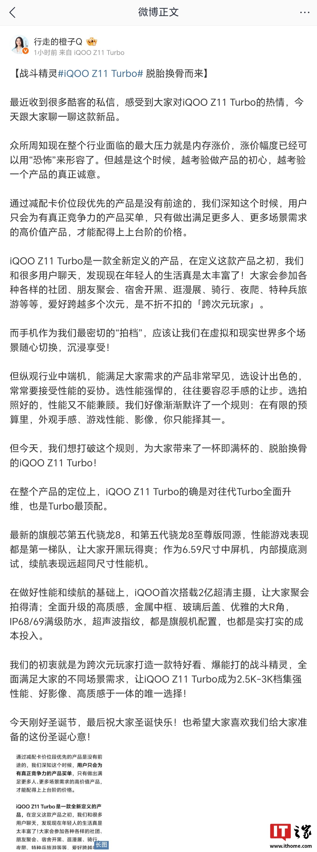据IT之家此前报道,iQOO Z 系列产品经理邢程 12 月 25 日谈起了 iQOO Z11 Turbo 新机,她表示现在整个行业面临的最大压力就是内存涨价,涨价幅度已经可以用“恐怖”来形容,越是这个时候,越考验做产品的初心。