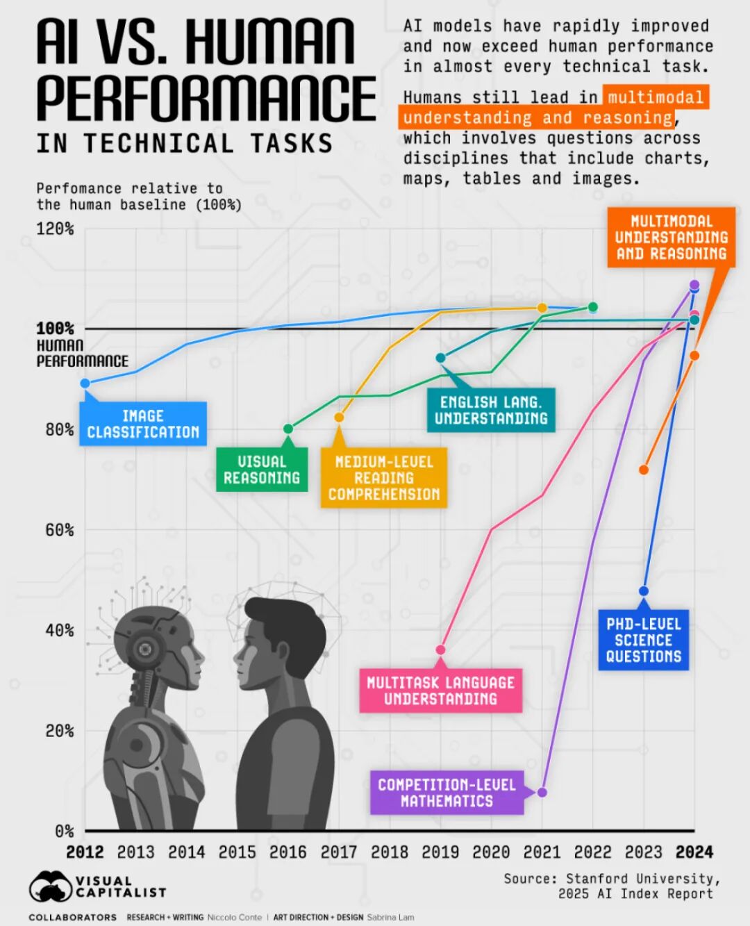 目前,AI系统唯一尚未赶上人类的领域是多模态理解与推理,而这项任务涉及跨多种格式和学科(如图像、图表、图解)进行处理和推理。不过,这一差距正在迅速缩小。