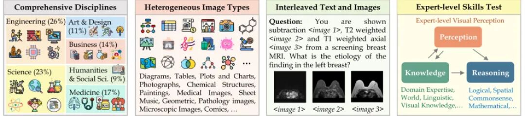 MMMU数据集的四大特性 —— 全面性:涵盖六个广泛学科领域与30个大学科目,包含1.15万个大学难度级别的问题;图像类型高度异质:包含极其多样化的图像类型;图文并茂:文本与图像交错混合,需要跨模态理解;专家级感知与推理:要求具备扎根于深厚学科知识的专家级感知与推理能力。