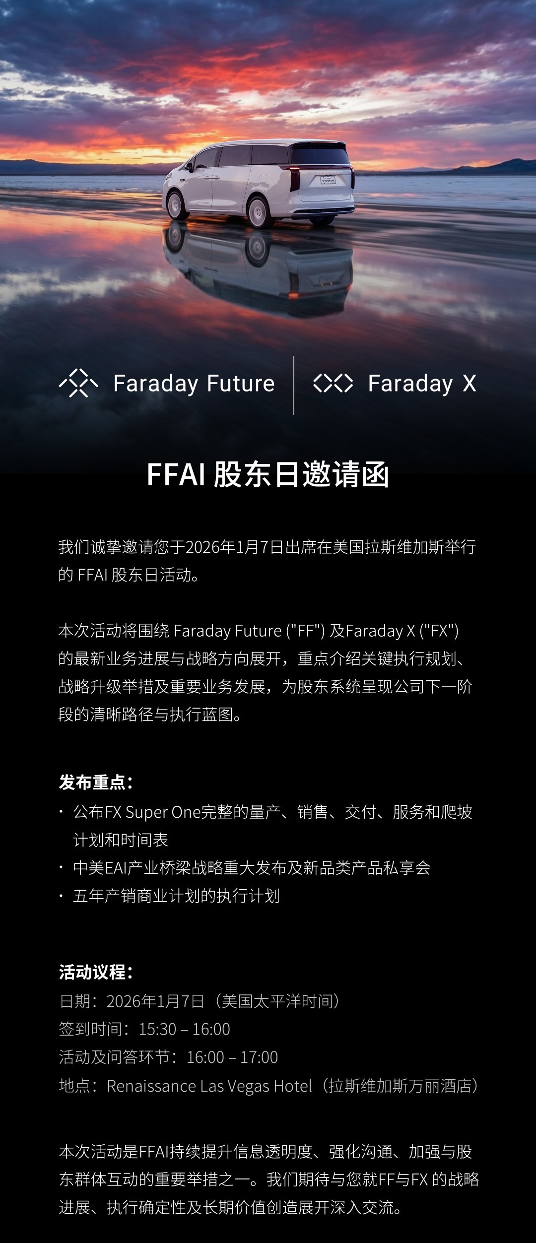 IT之家 12 月 30 日消息,法拉第未来宣布,将于 2026 年 2 月 13 日召开特别股东大会。公司呼吁股东对所有提案投赞成票。