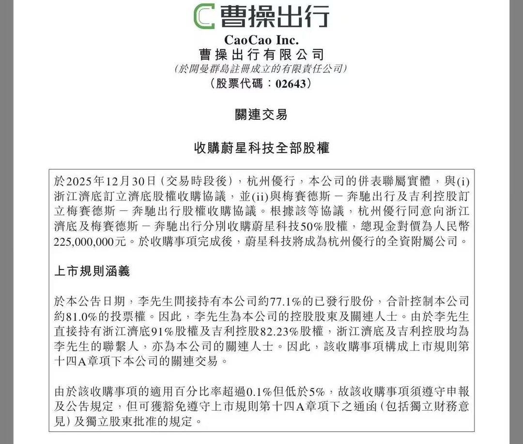 12月30日,曹操出行发布公告称,公司决定收购蔚星科技有限公司(耀出行)100%股权,总现金对价为人民币2.25亿元。于收购事项完成后,蔚星科技将成为杭州优行的全资附属公司。