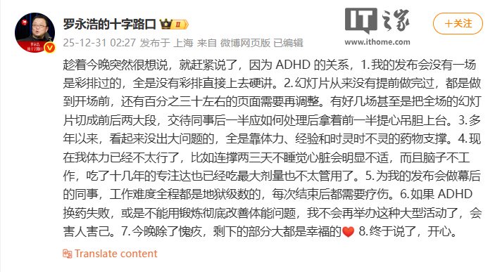 IT之家 12 月 31 日消息,今日凌晨,罗永浩在微博发文回应“科技春晚”迟到 40 分钟,称因为 ADHD(注意缺陷与多动障碍)的关系,发布会没有一场是彩排过的,全是没有彩排直接上去硬讲。幻灯片从来没有提前做完过,都是做到开场前,还有百分之三十左右的页面需要再调整。