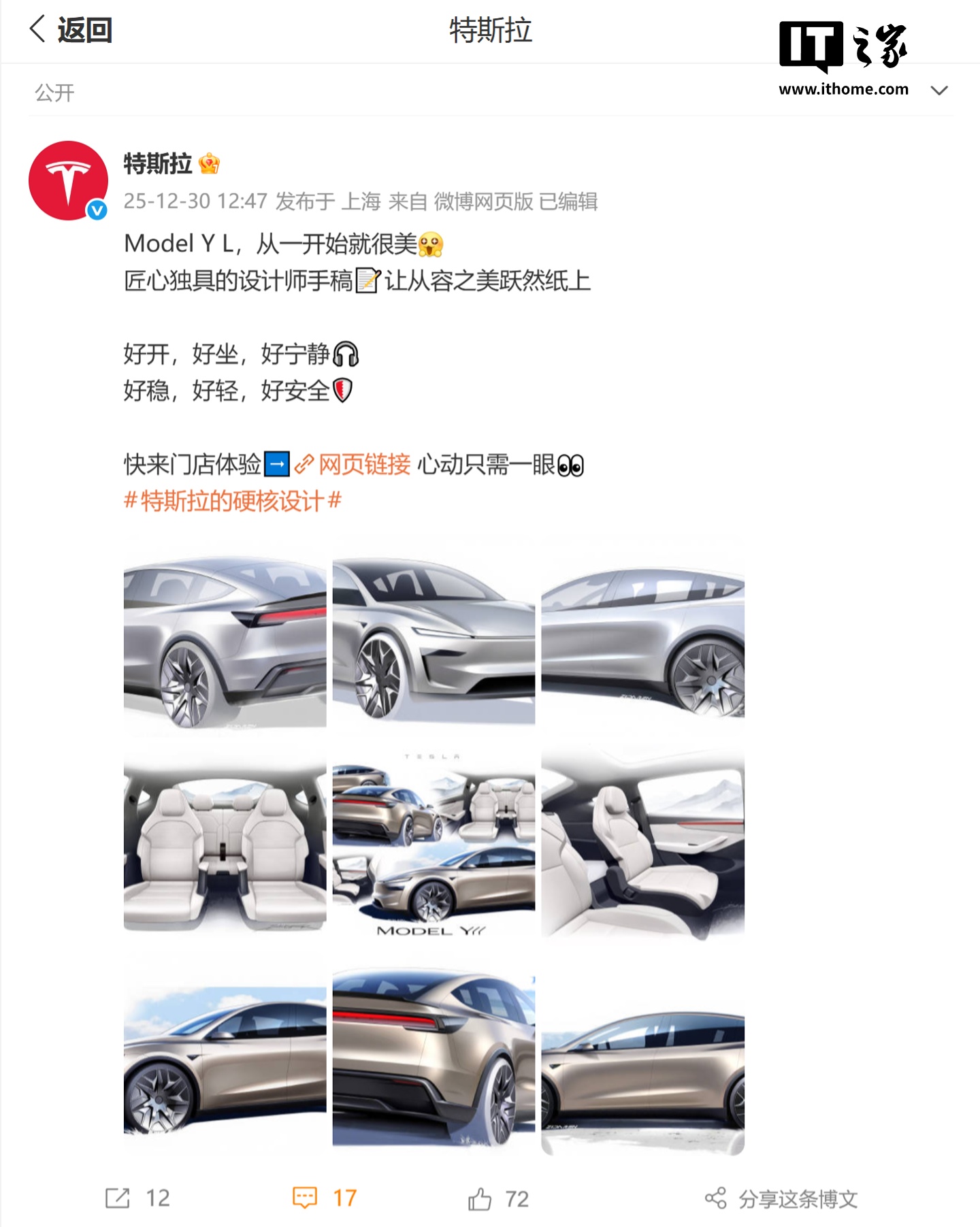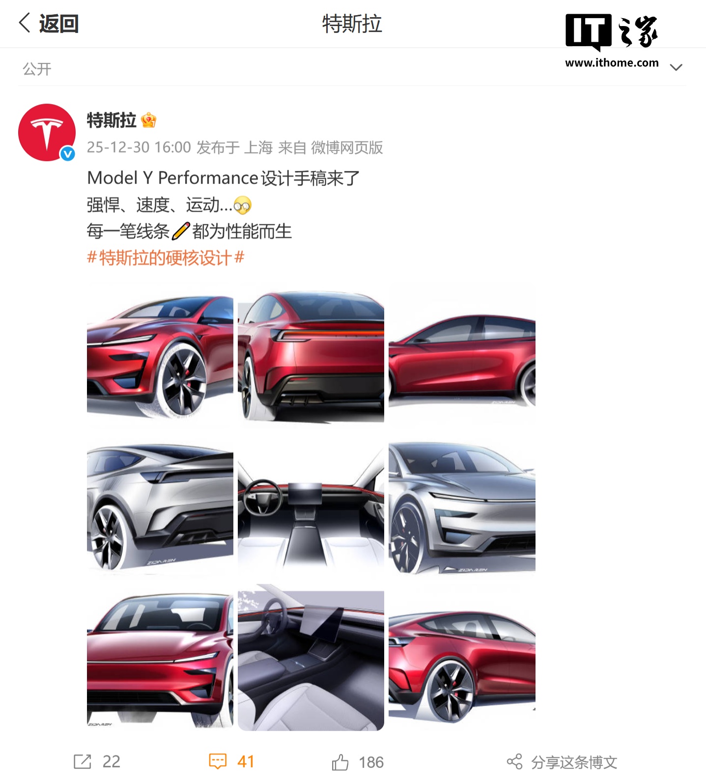 IT之家 12 月 31 日消息,特斯拉昨日(12 月 30 日)发布微博,分享了 Model Y L 和 Model Y Performance 车型的设计手稿。