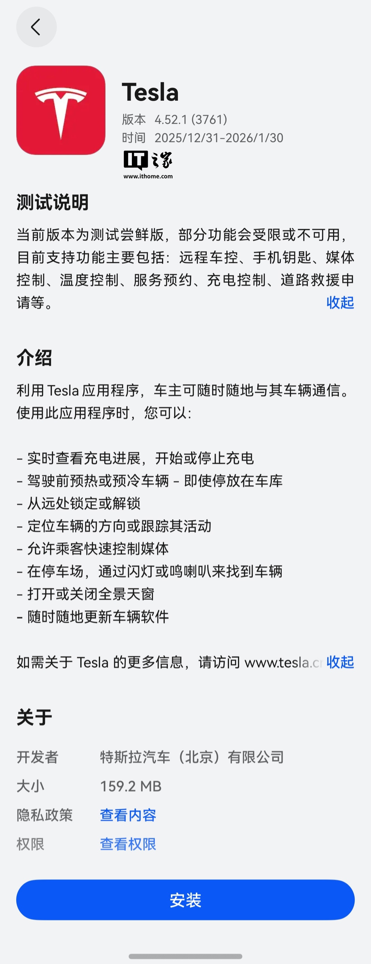 IT之家 12 月 31 日消息,特斯拉 Tesla 鸿蒙版 App 今日在华为应用市场开启了测试尝鲜,版本号为 4.52.1 (3761),已支持远程车控、手机钥匙、媒体控制、温度控制、服务预约、充电控制、道路救援申请等功能。