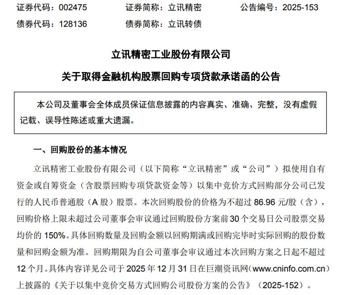 2025 年 12 月 31 日,立讯精密工业股份有限公司(证券代码:002475,证券简称:立讯精密;债券代码:128136,债券简称:立讯转债)同步发布两则公告,宣布拟以集中竞价交易方式回购公司 A 股股份,并已取得中国工商银行深圳市分行出具的股票回购专项贷款承诺函,为回购计划的实施提供资金支持。
