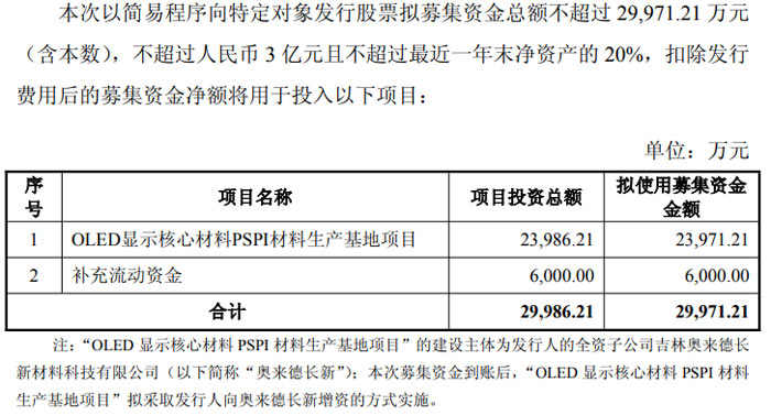 近日,吉林奥来德光电材料股份有限公司(证券简称:奥来德,证券代码:688378)披露 2025 年度以简易程序向特定对象发行股票预案(修订稿),公司拟通过定向增发募集资金不超过 29,971.21 万元,用于 OLED 显示核心材料 PSPI 材料生产基地建设及补充流动资金,助力 PSPI 材料国产替代进程加速。
