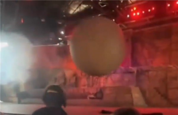 突然一块重约180公斤的巨形道具球脱离轨道,朝观众席方向滚动。
