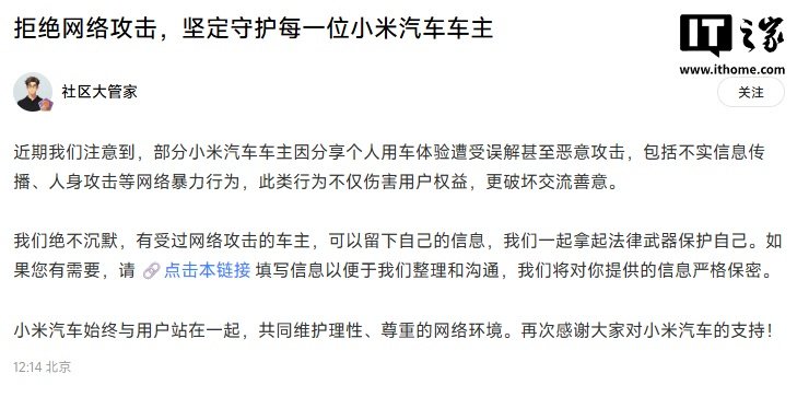 IT之家注意到,去年 9 月 26 日,小米官方在小米汽车社区发文 ——《拒绝网络攻击,坚定守护每一位小米汽车车主》,提到有受过网络攻击的车主,可以留下自己的信息,一起拿起法律武器保护自己。